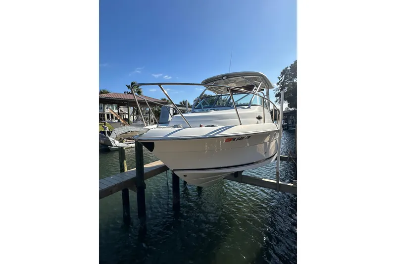 Featuring many of the extras found on bigger walkarounds. As a fishing machine, the R245 has six horizontal tubed rod holders, Plano drawer tackle storage, a cast bronze sea strainer and a best in-class livewell. Compared with leading rivals, the R245 has up to six more inches of cockpit freeboard, a four inch wider cabin entryway and the in-floor locker is triple the size of the leading rivals. In the cabin, the dinette converts to a full-sized V-berth for two. Standard teak and holly flooring is easy to maintain and creates a nautical flare. A color matched fiberglass headliner creates a clean look. A large screened hatch and opening port lights provide a cooling breeze. The cabin galley is equipped with maple cabinetry, a solid surface counter top and a stainless steel sink. An optional refrigerator is part of a Cruise Package. A standard porta-pottie with Vacuflush is positioned under the seat cushion.