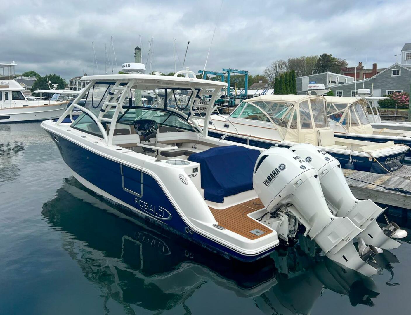 The R317 is available with the latest in innovative features. A huge integrated walk-around swim platform and side entry door makes entry and exit a breeze. The helm station features a standard 12" glass dash with a 16" screen upgrade available. Push button backlit switches are arranged in highly polished acrylic panels. Stereo remote, power supply, and auxiliary stereo inputs are at your fingertips. A stainless steel steering wheel and hand stitched sun visor complete the compliment. The R317 is available with the optional Optimus 360 joystick docking system making maneuvering in tight spaces safe and simple. With standard 600 horsepower from twin outboard engines, the R317 jumps onto plane and has a top speed that can get you where you want to go in a hurry. Four-stroke fuel injected technology combined with the Robalo Hydro-Lift hull maximizes efficiency. UNDER 55 HOURS