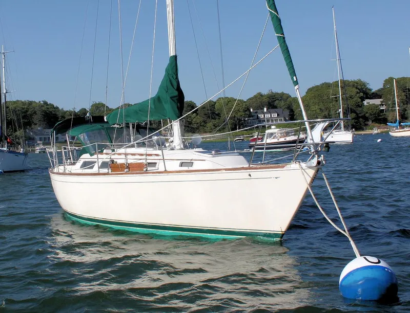 Green cockpit dodger and bimini. Custom, frame-less, canvas winter cover made by the Canvas Store in Huntington, NY. Cockpit table. Custom canvas winter cover. Misc. engine spares including filters and hoses. Danforth anchor with chain and nylon rode, three docklines, two fenders, boat hook, horseshoe buoy, fire extinguisher, emergency tiller, electric auto/manual bilge pump, Whale manual bilge pump. Inclinometer.