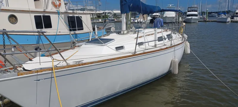 The 11,500-pound displacement boat came in three models: the performance-oriented fixed-keel model, which draws 6 feet; the centerboard model, which draws 4 feet with the board up and 7 feet, 8 inches board down; and the wing-keel version, which draws 4 feet, 6 inches.