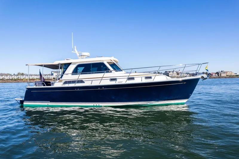 The layout offers a natural flow between the cockpit and salon, creating a functional and inviting space for entertaining or relaxing underway. Large salon windows provide excellent visibility and natural light, while tinted glass and exterior window screens enhance privacy and reduce solar gain. The upper salon settee converts into an additional sleeping area, increasing onboard flexibility for guests. Interior finishes reflect Sabre's reputation for quality craftsmanship, with thoughtful storage solutions and durable materials throughout.