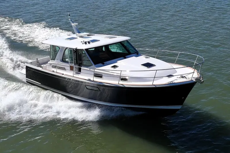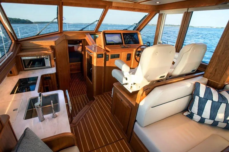 Highlights include a spacious salon with two banks of seating over six feet in length and a half-up galley that incorporates all the amenities of a modern kitchen without wasting an inch of precious storage volume. Below deck, a versatile hybrid lounge functions as guest berth, private retreat, or home office, depending on her owners' needs. Her master stateroom is iconic Sabre, featuring an island berth and numerous storage compartments, all in warm American cherry. Finally, an adaptable utility room beneath the salon sole provides space for various supplemental storage and appliance solutions, including a side-by-side washer and dryer, wine cooler, or storage lockers.