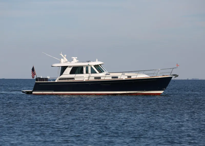 Introducing the 2017 Sabre 48 Salon Express SKYDOG, a stunning Downeast vessel that seamlessly blends elegance with performance. With an overall length of 48 feet, this boat boasts a composite fiberglass hull designed in a Deep Vee shape, ensuring smooth navigation through various waters. Powered by twin Cummins QSC 8.3 inboard engines, each delivering an impressive 550 hp, it offers a cruising speed of 27 knots and a maximum hull speed of 32 knots, SKYDOG accommodates up to 12 guests, featuring two well-appointed cabins and two heads, ensuring comfort for all on board. The electric windlass and joystick control enhance ease of handling, making docking and maneuvering a breeze. With a cruising range of 347 miles, this vessel is ready for extended journeys. Experience the perfect combination of luxury and performance with SKYDOG, where every detail is crafted in the Maine tradition for an unforgettable experience.