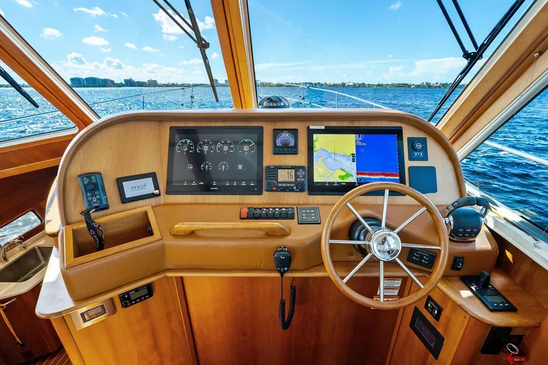 - Air-conditioned flybridge with Stidd helm chair and U-shaped settee