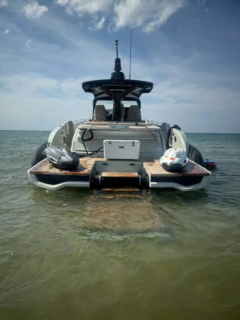 One of the Rebel 47's signature features is its transformer-style hydraulic swim platform. Lower it to water level for swimming or raise it flush with the cockpit for entertaining. Extend it when approaching shore to bring the boat close to the beach, stepping directly onto sand in extremely shallow water - ideal for beach days, paddleboarding, or family activities right off the boat.
