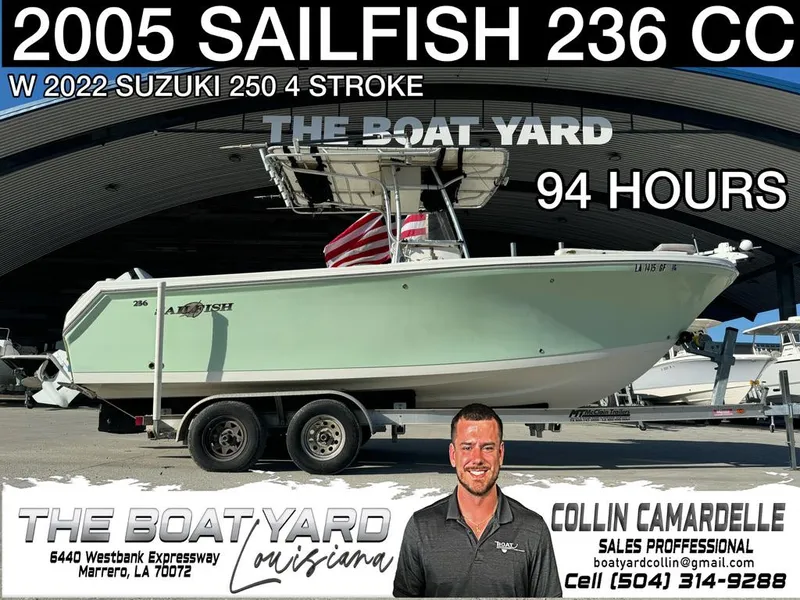 2005 Sailfish 236 CC2022 Suzuki 250 (94 Hours)2018 McClain Tandem Axle Trailer***FINANCING AVAILABLE***Trade Ins Accepted$57,995Contact Collin for more info 504-314-9288NEW ELECTRONICS SET UP FOR OFFSHORE FISHING-Simrad NSX multi function display, halo radar and 1000kw thru hull transducer-Brand new house/ starting batteries and onboard charger.-New Minkota Ulterra trolling motor with spot lock and onboard charger in 2022. -Dual large capacity live wells with lighting in transom and leaning post.-Cockpit shower with 13 gal fresh water tank.-Raw water wash down.-Flush toilet with holding tank.-LED spreader lights-Under gunnel rod storage with courtesy lights.-Taco telescopic outriggers and kingfish rod holders mounted in t top.-Lenco trim tabs.-Massive port and starboard fish boxes in bow.SPECIFICATIONSLength: 23 ft 6 inBeam: 9 ftHull material: FiberglassNet weight: 3,450 lbsEngine: 300 hp Suzuki F300 outboardFuel tank capacity: 125 galWater tank capacity: 8 gal