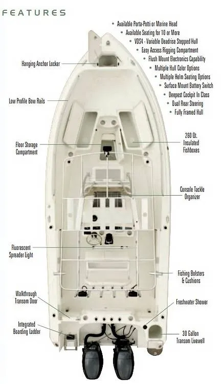 Fishing features include twin insulated 260 Qt forward bow fish boxes and large in floor storage compartment with overboard drain. Also a 30 gallon transom live-well aft. There is lots of tackle and under gunnel rod storage and rocket launchers as well as in gunnel rod-holders. Marine electronics include a VHF marine radio and a Simrad GPS-chartplotter-fishfinder.