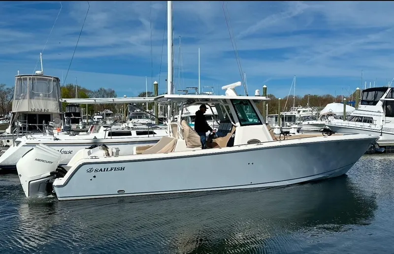 Sailfish 360 CC Elite, Powered with preferred Triple Mercury 300hp Outboards, 435 hours. 300-hour service completed. Garmin Electronics package, auto pilot, Joystick control, Skyhook and new FLIR Camera. Fully loaded with all factory options, forward seating with power table that converts into a lounge, port side access dive door, Factory hardtop with overhead display. Three Garmin GPSmap 7612xsv screens. Rear cockpit facing Garmin GPSmap 7608 mounted in the mezzanine seating. Open array radar and Garmin VHF-200 radio. Fusion stereo with Wet-sound amplifier, Wet-sound speakers with subwoofer and LED lighted grills. Under gunnel LED lighting. Enclosed head, vanity sink and large double birth below console. Boat is stored indoors and in excellent turn-key condition. Ready for the season! Schedule a showing with the listing broker today!!
