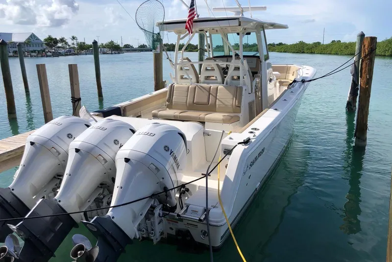 Seating for an incredible 19 passengers sets this boat apart, making her ideal for entertaining, island hopping or extended stays on the water. Serious anglers will appreciate the fully equipped fishing layout featuring 34 rod holders, two pressurized baitwells (42 & 32 gallons), outriggers, insulated coffin boxes and a full Garmin electronics suite.