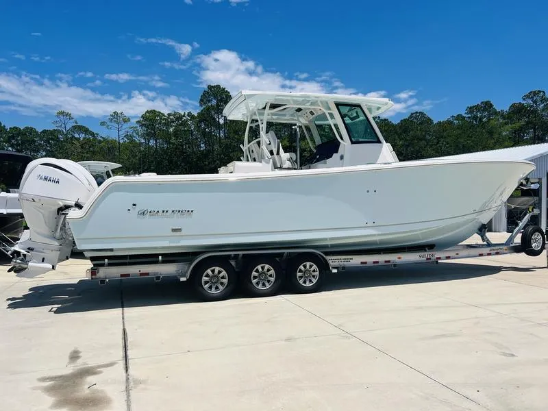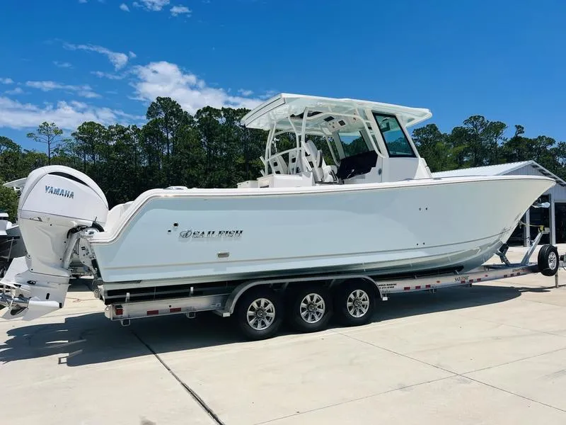 This 2024 Sailfish 360 CC comes powered by Triple Yamaha 300! This boat comes fully loaded with options including Brand New electronics Package with Triple Garmin MFDs, Garmin Radar, utility leaning post that includes a fridge, electric grill, Corian countertop, and tackle storage, Yamaha Auto Pilot + Full Manuverability, A/C and Heat in the birth and at the helm, flip down aft seating, (2) live wells, triple llebroc helm seating, large step down birth with queen mattress and head, large console extension lounger, u-shaped bow seating with removable cushions, electric aft shade, and a triple axle amera trail trailer available for purchase!