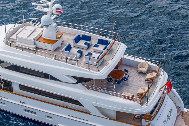 Her aft decks are arranged across multiple levels with teak flooring, sun pads, alfresco dining areas, and deep-cushioned lounge seating.