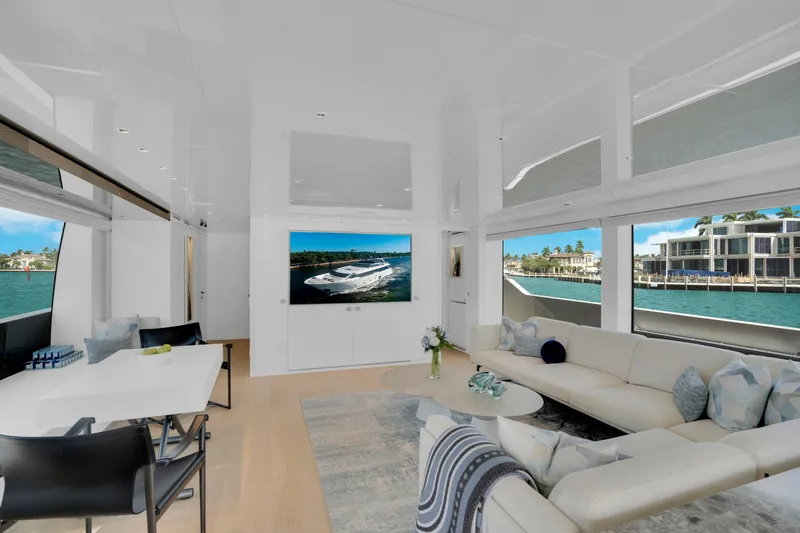 Once in the main salon one sees the innovative asymmetrical design that offers additional volume to the main deck. There is an outboard lounging area to port and a table perfect for gaming, coffee or breakfast. To starboard one will find an L-shaped settee with coffee tables. The Salon offers large windows, white and airy décor and light wooden flooring. There is a large TV on the forward bulkhead that is easy to see from anywhere in the salon.