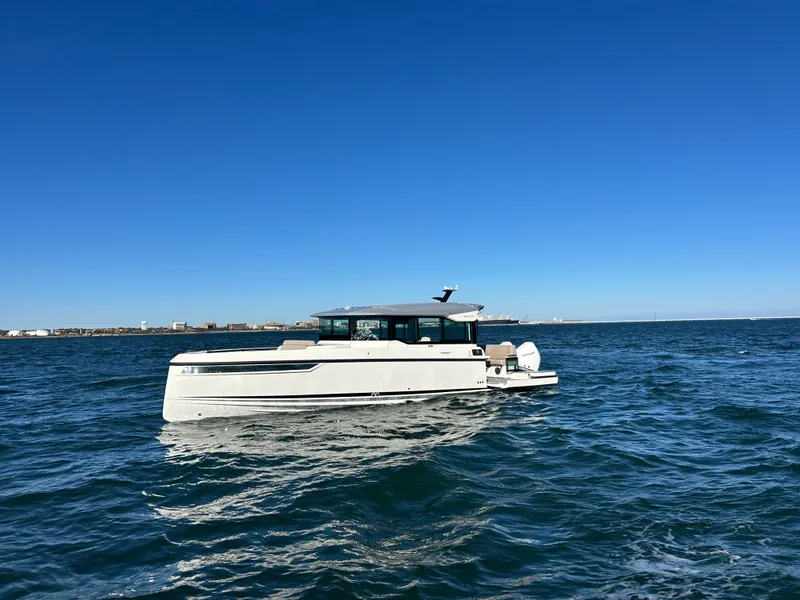 - Advanced Navigation & Technology: The boat is equipped with the Advanced Navigation Package, which includes two 12" Simrad touchscreen displays for navigation, engine data, and system monitoring. The Zipwake Interceptors System provides automatic trim control for a smooth, stable, and efficient ride.