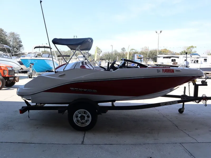 2019 Scarab 165 ID, USED 2019 SCARAB 165 ID JET BOAT | FOR SALE BIMINI TOPAM/FM STEREOFLOORING The 2019 Scarab 165 ID is a compact, sporty jet boat built for quick fun and easy ownership. Powered by a responsive Rotax jet propulsion system, this lightweight 16-foot performer delivers strong hole shot, nimble handling, and smooth acceleration. The jet drive provides confident shallow-water capability and eliminates the exposed propeller, making it ideal for families, first-time boaters, and anyone who loves watersports in a smaller, easy-to-tow package. LAYOUT & COMFORT Despite its compact size, the 165 ID offers a surprisingly roomy and social cockpit layout. Comfortable wraparound seating keeps passengers secure and connected, while the open bow provides additional forward seating. The rear swim platform sits low to the water, creating an inviting space for swimming, gearing up for tow sports, or relaxing at the sandbar. The deep cockpit design adds comfort and peace of mind for everyone onboard. FEATURES • Integrated rear swim platform • Swim ladder for easy water access • Adjustable helm seat • Bow seating with cushions • Tow eye for watersports • Marine-grade upholstery • Cup holders throughout • Walk-through windshield • Compact, easy-to-trailer design TECHNOLOGY • Rotax jet propulsion system • Digital engine instrumentation • Marine audio system • Push-button start • Responsive single-engine control SAFETY • Jet propulsion - no exposed propeller • Deep cockpit for passenger security • Wide, stable beam for its class • Integrated reboarding ladder • Scarab performance hull design • High-visibility helm layout SPECIFICATIONS Length Overall: 16'0" Beam: 7'1" Draft: Approx. 12" Dry Weight: Approx. 1,800 lbs Fuel Capacity: 21 gallons Engine: Rotax Jet Engine Propulsion: Jet Drive Seating Capacity: 5 persons Hull Material: Fiberglass Boating season is still in full swing, and best spent on a boat from VForce Marine - Your Marine Superstore.