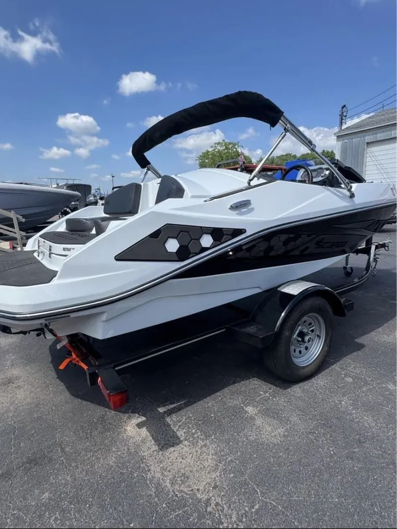 Like New Jet boat only 55 hours on this little 60mph rocket! 250hp Rotax Supercharged engine, Full mooring cover, Bimini, Bluetooth Stereo, Ski Locker, Large swim platform, Trailer included, 5 person Capacity