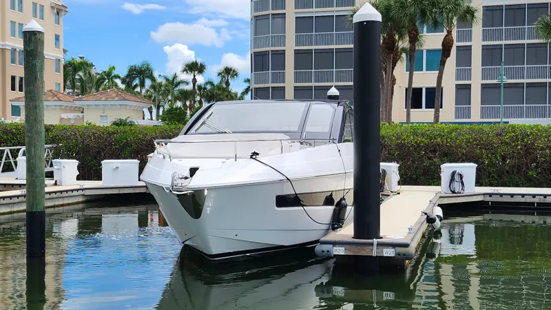 2025 redesigned to offer the amenities, sophistication and comfort also found in the larger models. Flexible deck layouts allow for a gourmet station including a grill at the stern or a sunpad/bench seating. Two balconies are standard on either side, offering more space for relaxing and entertaining. The hard top with its retractable roof offers plenty of sun or protection from the elements. Ample seating throughout the 375 with ease of access to the bow through the windshield walkthrough. The cabin sleeps four with aft and forward berths along with a full head with a separate shower, and a full galley.