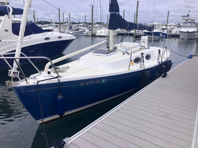 A large comfortable cockpit, classic lines, traditional details, and an efficient hull shape. Most important of all, sailing is delightfully easy. The Harbor 25 has a self-tacking jib and in boom roller furling for the main. It is also equipped with an inboard engine, a head compartment for full-sized people, and bunks for naps and overnight cruising. The self-bailing cockpit of the Harbor 25 is eight feet in length and comfortably seats six adults. The halyards are internal, and they are led aft to the cockpit for easy sail adjustments. Her inboard gasoline engine with sail-drive makes navigating in the marina and mooring field a dream.
