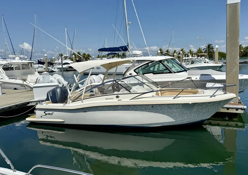 Scout Boats' 245 Dorado is the perfect boat for both fishing and family fun offering the ultimate in comfort, style and performance. Designed with Scout's revolutionary hull design, the 245 is incredibly fuel efficient and offers you tremendous savings on operating costs annually. The lines of the 245 are accented by another Scout first, the design of the optional hard top. This unique design houses built-in speakers and spreader lights, and truly adds sophisticated appeal to the model. The 245 Dorado comes standard with port and starboard Flexi Teak transom platforms with a boarding ladder, and Scout's revolutionary removable stern seat/wavegate that make it ideal for landing the catch of the day, or just enjoying a day of swimming and diving. With an overall length of 24'5" and wide beam of 8'6", the 245 provides a roomy, safe boating experience for the entire family.