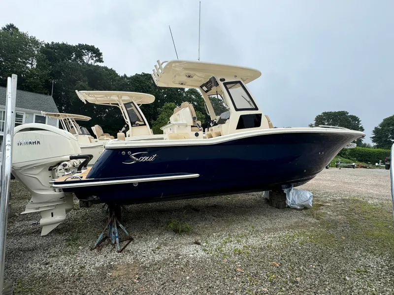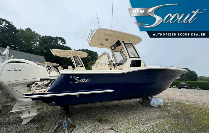 This 2025 Scout 260 LXF now in stock. This new model is powered by the premium S series twin Yamaha 2.8 Liter F150XSA4 with color match white motors. The boat features Seekeeper Ride Vessel Attitude control system for smooth and stable performance. This is a Midnight Blue (dark nav) hull with full hull color upgrade and twin 12" Garmin displays.