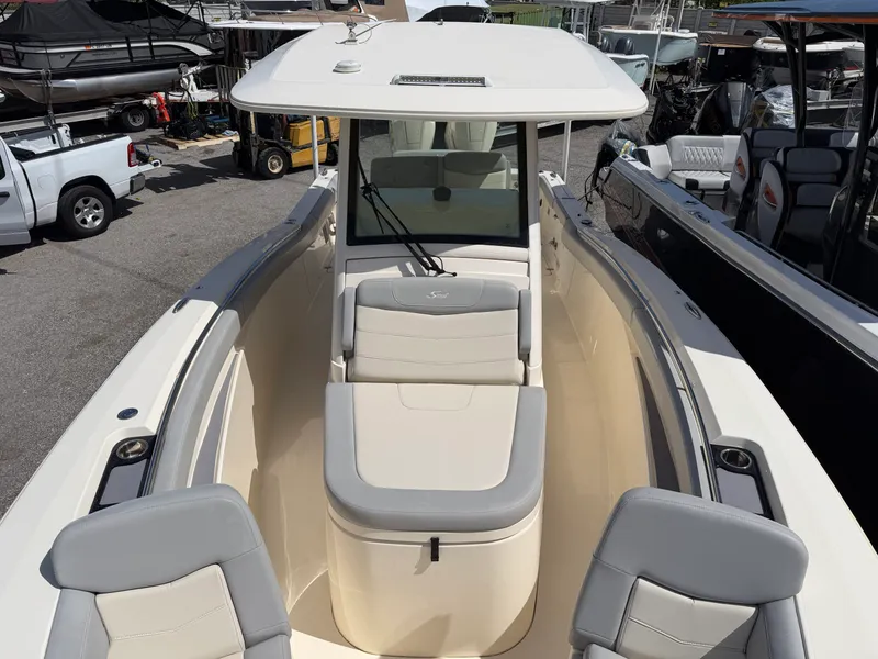 the Scout 305 LXF, was one of the only 30-footers in its class with a console berth down below for overnighting. This 30'4"-long offshore model with a 9'10' beam rides on a proven deep-V hull and features a cockpit designed with all the creature comforts active families are looking for in an open boat.