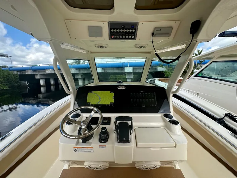 - Leaning Post w/ 3 Tackle Drawers Port Side, Trash Unit Stbd Side, 65 Quart YETI Slide-Out Aft Cooler, Sink Port Side Countertop, Cutting Board Starboard Side Countertop, Fiberglass Cooler Box Countertop and Twin Bucket Helm Seats w/ Armrest Box