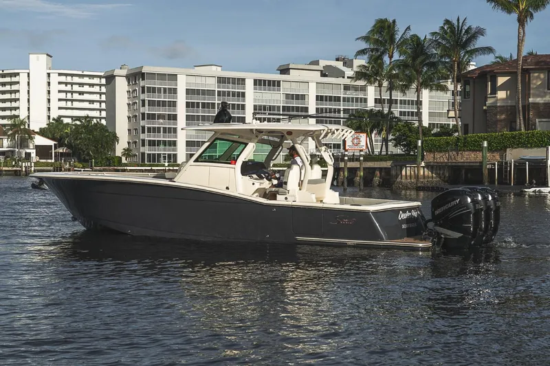 "Dealer Ship", our Scout 355 LXF, has to be one of the best equipped available. She features a Seakeeper 3, triple Mercury Verado 350's with joystick control, FLIR night vision, power retractable aft sunshade, anchor camera, light package, full boat cover and individual covers; and D/C air conditioning for the cabin and helm. She just had new Garmin 8612xsv's installed July 2025. The shark gray hull gives her a unique look aided by the black open array high definition radar. She is lift kept with no bottom paint in Boca Raton, Florida.