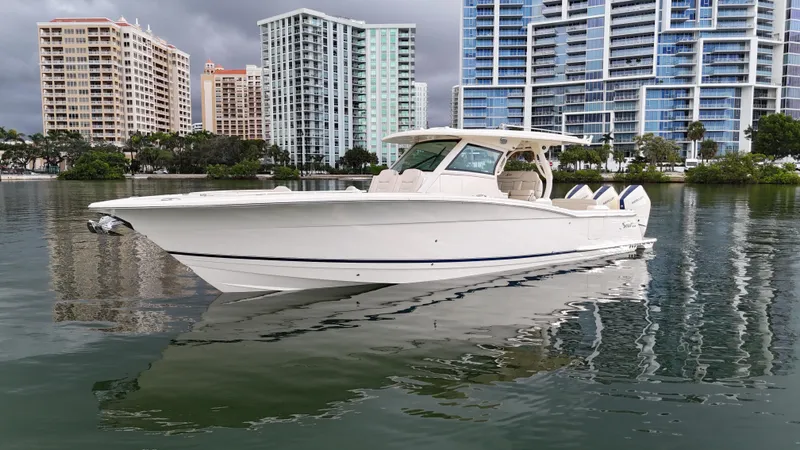 The 377 LXF is built as the ideal blend of performance, luxury and styling. Loaded with Scout innovation, this model has a lithium ion battery with battery management system (no generator necessary); portside swing-in boarding door with ladder; double sun deck lounge with cushions, armrests and underside storage forward of the console; key fob remote controlled lights; spacious cabin down below and an enclosed head with a porcelain vessel sink with Corian vanity and mirror; marine head with electric overboard discharge with an 11 gallon holding tank; 120V air conditioning & heat in the cabin and at the helm; and so much more. Upgrade your experience out on the water with an available Seakeeper 3 gyro stabilizer; optional summer kitchen complete with grill, sink, cutting board, manual slide-out cooler, seat cushion and bolster; and your choice of upholstery color package. Dive in to discover more.