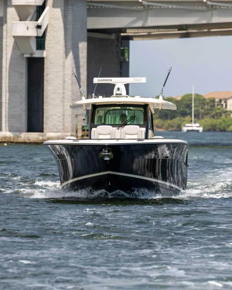 The 377 LXF is a high-performance luxury boat with advanced features like a lithium-ion battery system, spacious cabin with air conditioning, and a sophisticated enclosed head. It's crafted with Carbon Epoxy Construction for durability and offers options like a Seakeeper stabilizer and a summer kitchen.