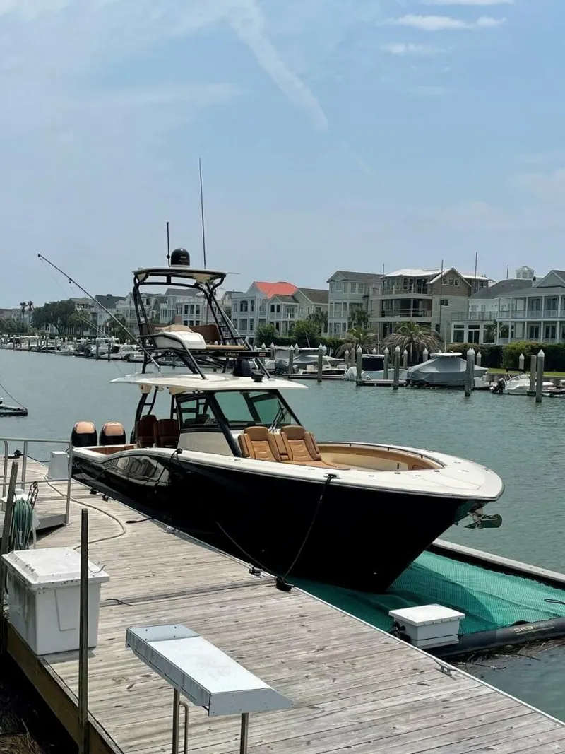 “Ace with a Hook” brings elegance and style to the waterways. Scout designed the 420 for space and comfort to suit the needs of anglers and cruisers. The seating arrangement at the bow hosts multiple passengers with a retractable table that converts to be flush with the deck or add the insert cushion for sun lounging. Equipped with a Lewmar Windlass system, there are storage lockers combined with the forward seating arrangement. The center console alone holds several of the wonderful amenities she has to offer. From the custom tower and second helm station to the elegant cabin with galley, separate head and stall shower. With the black color scheme of this CC the helm is no different arranging three (3) Garmin units, joystick/skyhook controls for optimal maneuvering with secondary switch panel above. The captain and four (4) other passengers will cruise comfortably at the helm combining a ladder leading to the tower and access to the batteries/charger/switches/C Zone modules/sea keeper just aft. The fishing deck allows for great space to get to work fishing and handling the spread. The rocket launcher is removable, two (2) large macerated fish boxes port and starboard, large bait-well center transom, transom door to starboard and dive door to port.
