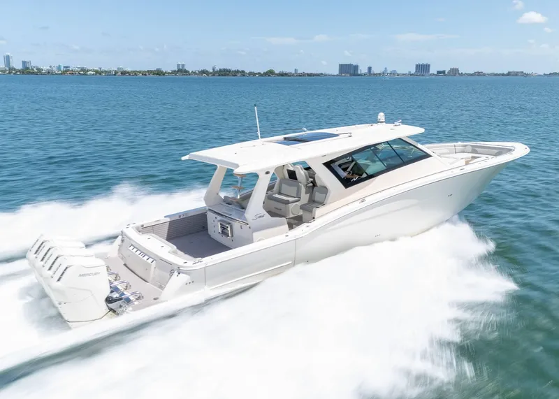 This 53-foot luxury center console is powered by quad Mercury V12 600 HP outboards, delivering exhilarating top-end performance, enhanced fuel efficiency, and intuitive joystick control. With its aggressive stepped hull design and carbon epoxy construction, the 530 LXF offers unmatched strength-to-weight ratio, stability, and handling in rough seas.