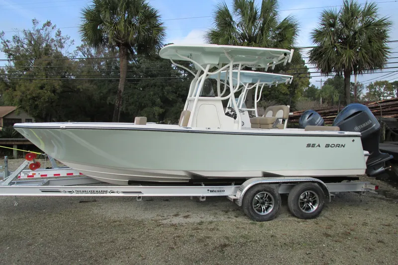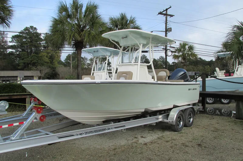 Yamaha F250, Sea Foam hull, Sandstone cushions, white powder coat, fresh water, raw water, porta potti w/ pump out fitting, aerated console livewell. twin 9" Garmins, Fusion stereo system, trim tabs, rear transom livewell, aft bench seat, rear Sea Freeze fish box, full bow cushions with removable backrests, hardtop, and trailer.