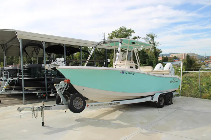 2022 Sea Chaser 24 HFC powered by Twin Suzuki DF 150s w/ 350 hours on them Whether you're heading offshore for fishing, exploring the coast or pulling a tube for family fun, the 2022 model year 24 HFC checks every box for on-the-water adventure. For boaters who love to raft up and swim, the 24 HFC comes standard with a portside entry door and a stern telescoping ladder for easy and safe access in and out of the water. Throughout the 24 HFC, find only the highest-quality stainless steel components, such as flush-mounted cup holders, rod holders and fold-down cleats. For fishing enthusiasts, keep more bait onboard inside the built-in 25-gallon stern baitwell, which easily doubles as dry storage when needed. Families and charter captains have plenty of room onboard the 24 HFC with the spacious U-shaped bow seating area, console front passenger seat and stern bench seat with a removable backrest. Contact your nearest Sea Chaser dealer today to see the 2022 model year 24 HFC! Notable Features: -Minnkota Ulterra Riptide Trolling Motor -Simrad 12" GPS Fish Fishfinder -Garmin VHF radio -Outriggers -Marine Matting at Bow -Forward Shade Top -Stereo -Tandem Axle Aluminum Trailer w/ Two Spare Tires -Porti-Poti -Table -Full Cushion Features may include: HULL & DECK 100 % Fiberglass/Composite Construction (No Wood to Rot) Molded Fiberglass Deck Liner High Density Fiber Core Foam Transom Fiberglass Grid System Quick Lift High Performance Step Hull Rigid Rub Rail with Stainless Insert Premium Gelcoat Port & Starboard Coaming Pads Blue/White Courtesy LED Lighting Package Diamond Pleated Upholstery Stainless Hinges and Gas Shocks on Marine Board Lid Stainless Bow Eye CONSOLE/STEPDOWN Binnacle Control Shifter Teleflex Shifter Control Cable Stainless Power Grip Steering Wheel / Tilt Helm Sea Star Hydraulic Steering Wiring Harness Digital Gauge, Switch Panel with 12V power AM/FM BT Radio w/ 4 spkrs/USB/AUX Plugs Bi-Fold Side Entry Door Footrest / Glove Box/ Utility Pocket Porta Potti Stainless Grab Rail (2) Stainless LED Cup Holders Quick Disconnect Windshield Fire Extinguisher Marine Horn with Stainless Cover Ultra Leaning Post with Backrest/ 4 rod holders/ 2 cup holders BOW Anchor Locker Stainless Anchor Chock w/roller Stainless Low-Profile Bow Rail Diamond Pleated Upholstery U-Shaped Bow Seating (4) Stainless LED Light Cup Holders Removable Bow Cushions (2) Removable Bow Backrests with Safety Pin 208 Quart/ 52 Gallon Insulated Storage Compartment 128 Quart/ 32 Gallon Insulated Fish Box Insulated Storage Compartment STERN 1100 GPH Bilge Pump 800 GPH Aerator Pump Fuel/Water Separator Approx. 25 Gallon Rear Bait Well with LED Light & Max Air Rear Bench Seating w/ Removable Backrest Easy Lift Battery and Bilge Access Rear Insulated Storage with LED Light (2) Stainless LED Cup Holders Splash Well Bilge Access with LED Light Stainless Telescopic Boarding Ladder Blue LED Underwater Lights Financing Options Available with approved credit and trades are welcome! Boat comes water ready with no hidden dealer fees. Delivery is available