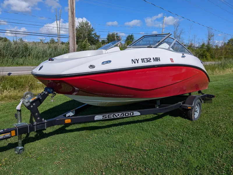 2010 SEA-DOO CHALLENGER 180215 ROTAX ENGINE WITH 168 HOURSMATCHING TRAILERMOORING COVERBOAT IS BEING SOLD ON CONSIGNMENT BY BRYCE MARINE IN AS-IS CONDITION - STARTS, RUNS, AND SHIFTS AS IT SHOULD - NEEDS COSMETIC ATTENTIONIts meticulous use of space and the ingenuity of a powerful, yet compact 215-hp Rotax 4-TEC engine gives this boat the expansive feel of a 20-footer inside an 18-foot shell.Some features below may be options not on this boat!DimensionsLength: 17 ft. 7 in. (5.36 m)Beam: 8 ft. 2 in. (2.49 m)Draft: 12 in. (30.5 cm)Dry weight: No Tower: 1913 lbs. (868 kg)Storage capacity: 23 cu. ft. (.65 cu m)Seating capacity: 8Weight capacity: 1383 lbs. (627 kg)Fuel capacity: 32 gal. (121 l)Dimensions (on Trailer)Length: 20 ft. 4 in. (6.2 m); tongue folded - 19 ft. 3 in. (5.86 m)Width: 8 ft. 2 in. (2.49 m)Height: No Tower: 6 ft. 1 in. (1.85 m)Gross weight: 2843 lbs. (1290 kg)EngineModel: Fuel injected, Rotax 1503 4-TECDisplacement: 1,494 ccHorsepower: 215 hp SCICCylinders/engine: 3Max RPM/engine: 8,000 rpmOctane: Minimum: 87Octane: Recommended 91Emission level: CARB 3-StarCooling system: Closed-Loop Cooling SystemElectricalGenerator: 30 amp (380 W)Battery: 12 VHull & DeckMaterial: Composite FRPVinylester barrier layer: StdFull fiberglass stringer: StdGraphics: StdDeadrise: 20 deg.Color: Scarlet RedPropulsionJet pump type: Axial flow: Single stageJet pump type: Pump diameter: 6 1/4 in. (15.63 cm)Impeller Material: Stainless steelImpeller Outside diameter: 159mm ± .07Reverse system: StdHull & Deck FeaturesCleats - Chrome (6)Cup holders - (8)Rub rail (black)Grab handles (10)Non-skid deckingNavigation lightsCourtesy lights (3)Tow eyes - stainless steel bow & sternSki eye - sternWalk-through - sternReboarding ladder - stern (2-step)Battery switch - stern storageEngine accessEngine blowerAuto bilge pumpStorage FeaturesIn-floor, lockableUnder seatGlovebox, lockableDual access - sternHelm FeaturesSteering - standardHornSeparated shift & throttle leverFuse boxSecurity system D.E.S.S. magnetic lanyard keyInstrumentation FeaturesCompassFuel levelTachometerSpeedometerHour meterMaintenance infoWater temperatureLow fuel levelLow oil levelLow oil pressureLow voltageOverheatHi voltageCheck engineSensor checkBattery protectionKeyCockpit FeaturesDash finish - Vinyl covered GrayOutlet - 12 volt accessory (1)Cooler - removableSeating FeaturesDriver Seat Track & swivelPassenger Seat Track & swivelStereo & SoundStereo system - satellite-readySpeakers - cockpit (2)MP3 portWindshield - fixedCertificationsNMMACMMATrailerSingle axleSwing-away tongue