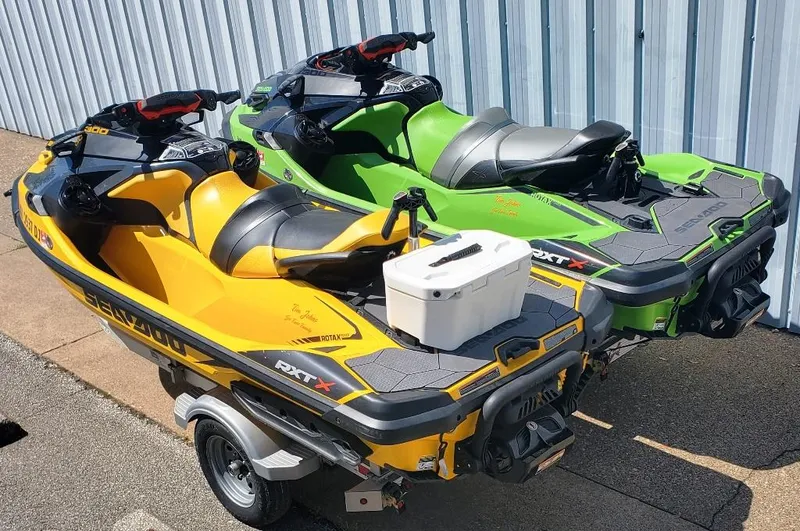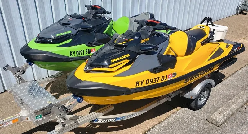 2021 Sea Doo 300 RXT-X 3 Person PWC (135.9" X 49.4") This unit is Yellow with Black & Gray accents. BRP Rotax 1630 CC ACE 300 HP supercharged 4S Engine with external intercooler. Features include a 7.6" wide digital display, tilt wheel, watertight phone Storage compartment, premium Bluetooth Stereo system Lift up ski tow bar, rear cargo linq system with cooler, Swim step and full storage cover. It is in excellent condition With only 47.3 engine hours use. 2020 Sea Doo 300 RXT-X 3 Person PWC (135.9" X 49.4"). This unit is Green With Black and Gray accents. Everything else is the same as the 2021 except it has quick install fender brackets (2) and 2 fenders and does not have a cooler. It is in excellent condition with only 65.2 engine hours use. The Trailer is a 2018 Triton single axle Aluminum with a lockable storage box up front.