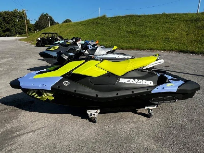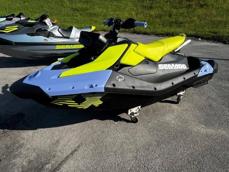 2024 Sea-Doo Spark Trixx for 3 Rotax 900 ACE- 90 iBR and Audio, 2024 Sea-Doo Spark® Trixx™ for 3 Rotax® 900 ACE™ - 90 iBR and Audio It's Showtime Make the water your personal stage. Spark Trixx Package Fill your days with wheelies, dives, donuts and more with the head-turning, newly evolved Spark Trixx. Unique handling features and sizzling colors are sure to make a splash at every sandbar. Features may include: Iconic Design Evolution Spark Trixx Jaw-dropping fun Smooth new design enhances the overall experience with improved comfort, easier boarding and exciting new ways to enjoy the adventure. Fresh features include 4.5-in. display and LinQ Lite attachment points for new accessories like POV camera mounts so you can capture all the craziness. New Trixx Mode Open a new bag of tricks Intelligent brake and reverse New Trixx Mode unlocks new water acrobatics like reverse donuts and nosedives to add even more show-stopping fun to the ride. A revised iBR system improves stopping power for more control and maneuverability. Bluetooth Audio System Music On, Off or In the Water BRP Audio-Portable System Tunes on the go! Floating, fully-submersible audio system. Robust design mounts securely and withstands saltwater use. Two listening modes offer 50 watts of perfect sound whether you're on the move or lounging around. Extended Range VTS Better tricks, at your command Extended Range VTS Sea-Doo exclusive extended range Variable Trim System lets you exaggerate how high you can raise the nose or how planted you stay on the water. Which means pulling off tricks has never been so easy, or fun. Integrated Footwell Wedges Take a stand Redesigned for a solid base New footwell wedges are better integrated into the deck to provide more stability and confidence when transitioning to different stand-up riding positions. Makes it easy to pull off tricks like a pro. Rotax® Engines High-octane fun Rotax® 900 ACE™ engine with Sport Mode The Rotax® 900 ACE™ brings 90 HP of high-thrill excitement to the water. It also offers Sport Mode for ultra-responsive control and the top performance in its class.