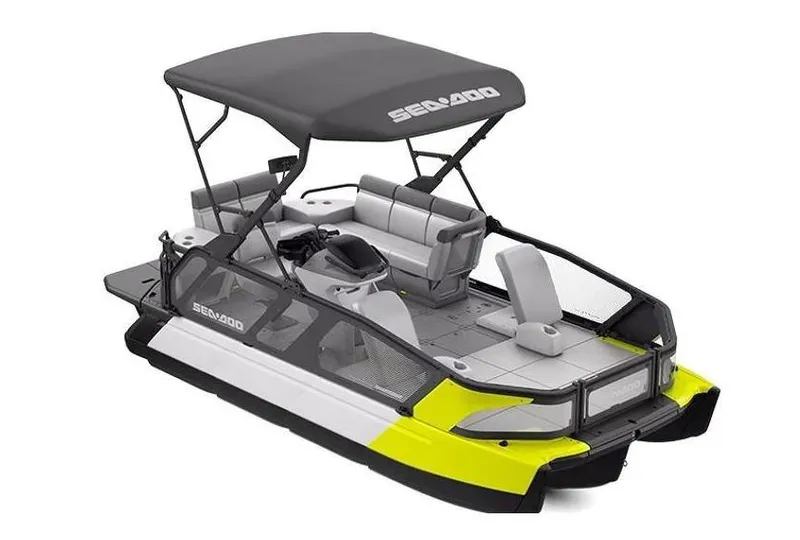 - Furnitures: Switch bimini top, Clear-view side panels, Stern lounge, Sun pads & Sport lounge, Sun pad backrest, 2x corner table, Driver seat with bolster, Rearview mirror, Garmin 7'' touchscreen GPS, BRP Audio System, Glove box with dual USB port, 12V outlet, Full Swim platform, Retractable boarding ladder, Quick-attach inflatable holder, Ski tow eye, LinQ™ attachment points, Under-deck storage compartment, Console storage net, Integrated anchor storage, LED Navigation lights, LED Courtesy light, Integrated cleats (4), 650W Battery Generator