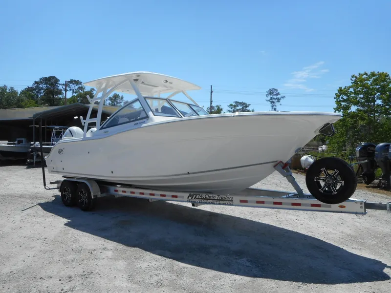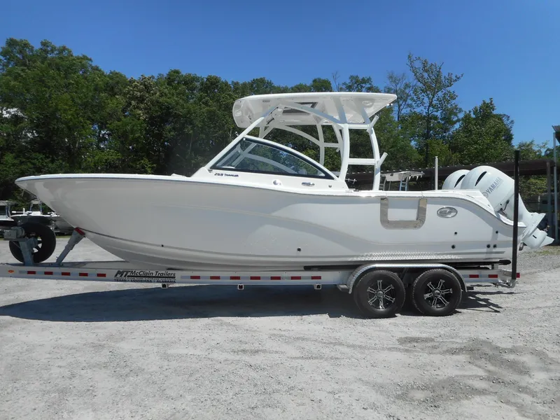 2023 SEA FOX 268 TRAVELER WITH TWIN WHITE YAMAHA F200XCA ENGINES ON A ALUMINUM MCLAIN TANDEM AXLE TRAILER.