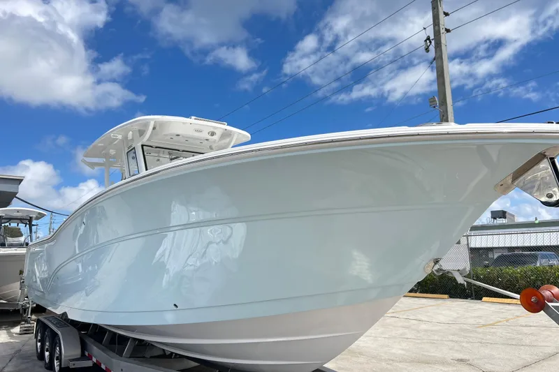 Here at Boat Kings we just got a brand new 328 Commander that just came in! This boat is loaded with a ton of options, and has a beautiful light blue hull, with a subtle, sleek white on grey theme with beautiful diamond stitched upholstery. There are so many features to go through that we are definitely missing some! Feel free to come into our shop and check out this boat! This boat has serious fishability and is clearly a family oriented boat, that can bounce you from island to island.