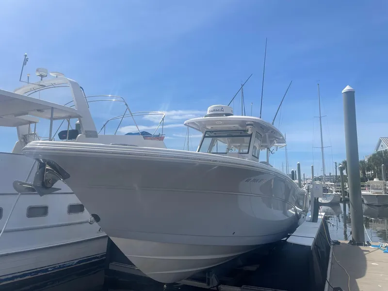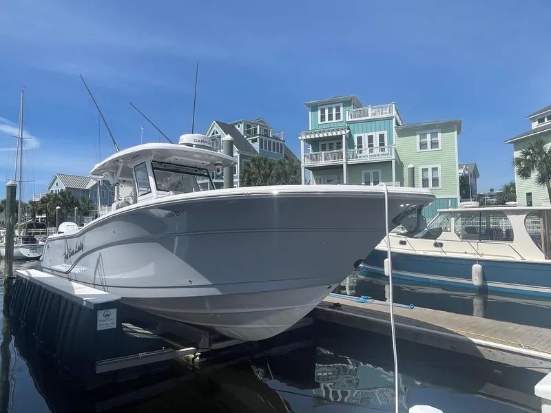 This 2022 Sea Fox 368 Commander center console is powered by triple Mercury 400 Verado's with 383 HOURS on them. It's loaded with options and ready to hit the water with Mercury joystick control, Dual Garmin 22" GPS units, Gemlux outriggers, Garmin radar, and more! This boat is also loaded with standard features including (2) 50-gallon aquarium style transom livewell's, an electric toilet and freshwater sink/washdown, a folding rear bench seat, and much more! Give us a call for more information at 910-755-7900.