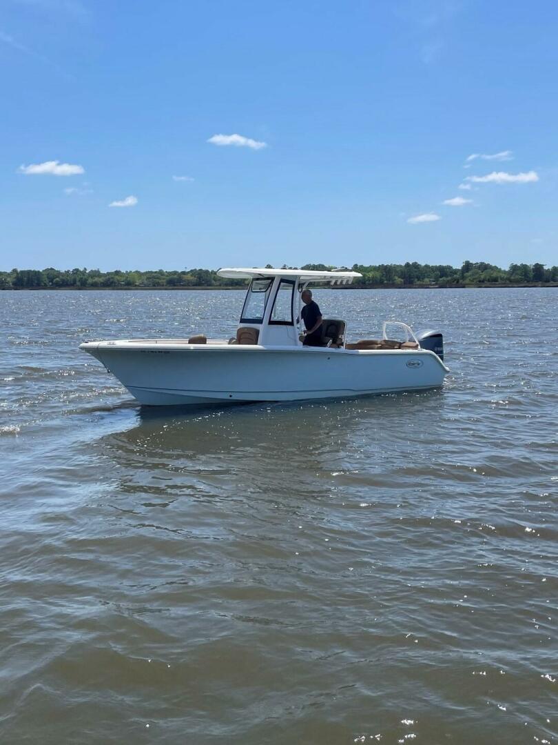 This Sea Hunt 234 Ultra has a forward seating arrangement with immaculate soft goods with back rests also combining storage lockers, anchor compartment, bow rails, and single passenger seating in front of the center console. The CC allows for ample storage, porta-potti, electric windshield vent, and hard top. The leaning post has foldup seating with passenger seating just aft. The stern seating combines live well, battery housing, wash bucket storage, and tow bar mounted to the transom.