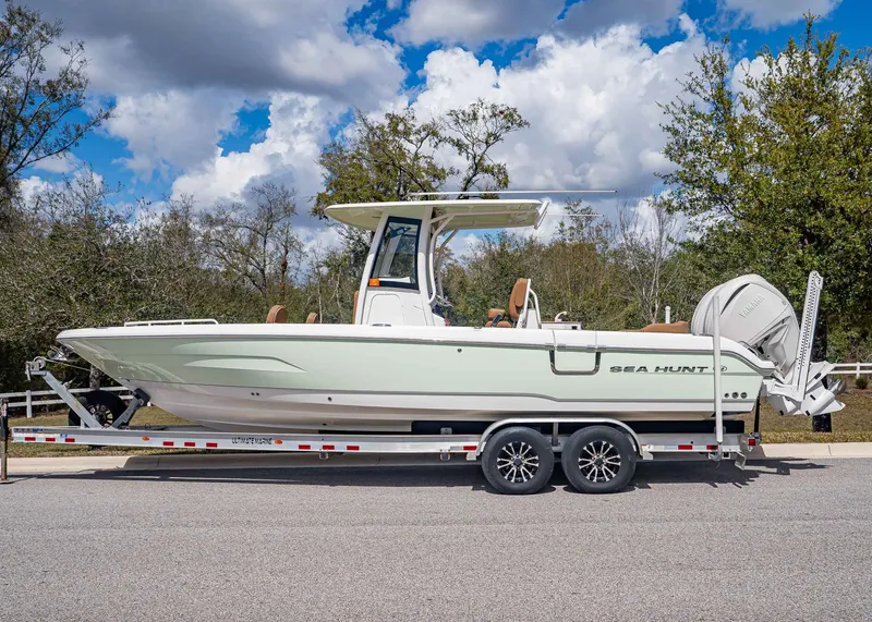 Command the water with this exceptional 2023 Sea Hunt Escape 28, crafted for the serious angler and family adventurer alike. This model features a sleek Abaco Green hull on the sides with a white bottom, providing a distinctive and modern look. The boat is powerfully equipped with twin Yamaha F300 motors, ensuring robust performance and reliability for any offshore excursion.