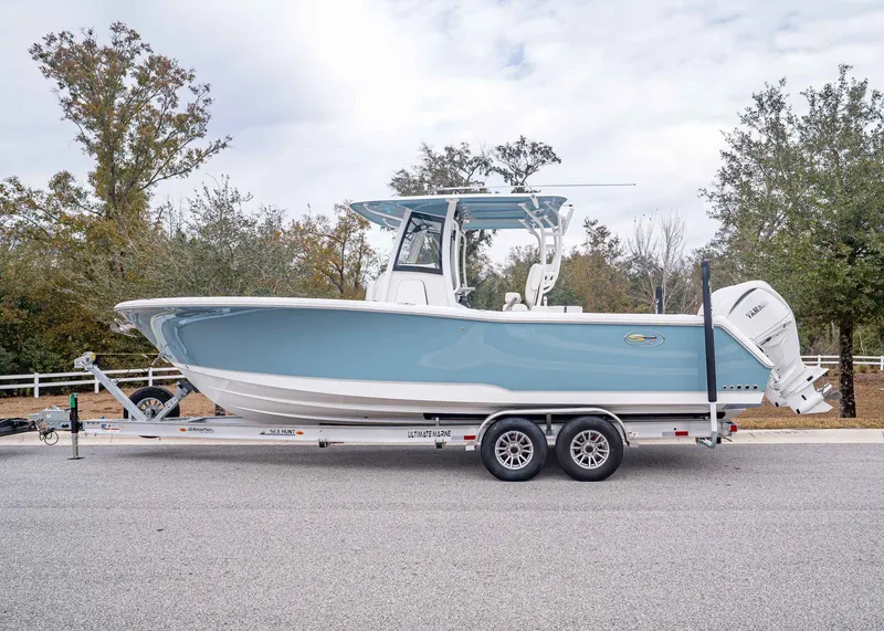 Command the water with this exceptional 2026 Sea Hunt Gamefish 28CB, crafted for the serious angler and family adventurer alike. This model features a sleek Slate Blue hull on the sides with a white bottom, providing a distinctive and modern look. The boat is powerfully equipped with twin Yamaha F300 motors, ensuring robust performance and reliability for any offshore excursion.