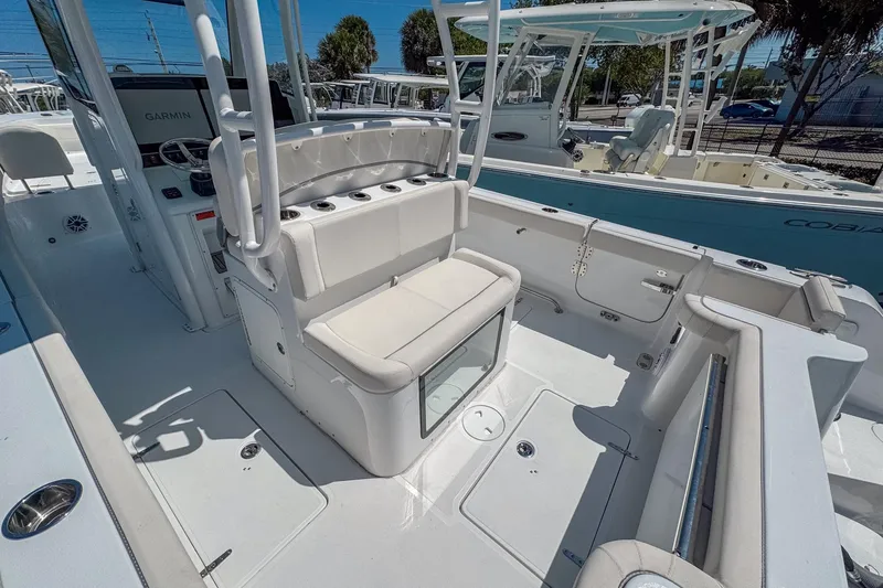 Designed with the avid fisherman in mind, this center console is equipped with a 42-gallon transom livewell, a 27-gallon bow livewell, multiple insulated fish boxes, and under-gunwale rod storage to keep your gear organized and accessible. The spacious layout includes comfortable forward-facing bow loungers, a rear fold-out bench, and a deluxe captain's helm, providing plenty of room for family and friends. A side-entry door allows for easy boarding and water access, while freshwater and raw-water washdowns make clean-up a breeze after a day on the water.