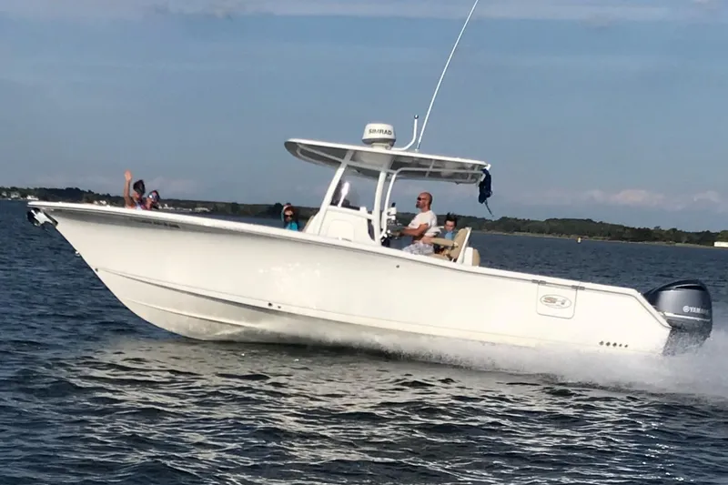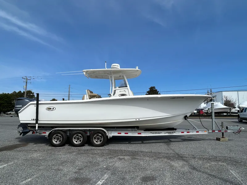 Here is a fine example of a well cared for Sea Hunt 30 Gamefish. This boat is powered with the Super reliable 300 Yamahas with only 740 hours. It has always been lift kept and primarily used in the waters of the Chesapeake Bay. Notable features of this boat are it's full Simrad Electronics package, Upgraded Stereo system, Large enclosed head w/electric toilet, Covenant protective covers, and Load Rite Elite Road Trailer Included. ((Seller has his eye on his next boat and priced this one to move quickly))