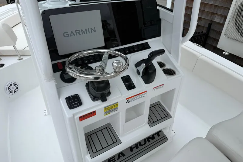 New 2026 Sea Hunt Ultra 235 SE with a 2026 Yamaha F200XD outboard. Entire Hull is Ice Blue. Garmin 12" Electronics Package with VHF radio and stereo. Tilt Seastar hydraulic steering. Ultra Mezzanine Fiberglass Leaning Post with Captains Chairs. Hardtop with Ice blue underside, freshwater mister system, LED lights and speakers. White Powder Coating package. Trim Tabs with Indicators. Underwater Lights. Side Entry Ladder with Ladder Holder. Ski Tow Bar. Porta Potti. Dash Panel Cover. Leaning Post Cover. Yamaha Reliance Series Prop. Our Ultra Series was created for families desiring the "Ultra" experience on the water! Sea Hunt delivers the most comfortable and functional center consoles in the industry with our Ultra Line. With its cushioned rear bench seating, and oversized bow area (complete with bow backrests and cup holders), it's easy to sit back and enjoy pleasure cruising and sandbar hopping. Rod Holders and Livewells instantly turn the Ultra into the most comfortable fishing boat on the water. Added standard features include: wrap around bolsters, bow cushions, color screen waterproof stereo, Yamaha Digital Command Link Gauges; and more.