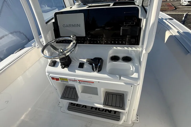 New 2026 Sea Hunt Ultra 255 SE powered by a Yamaha F350XSA2 with Tilt helm and Yamaha electric steering. Ultra Mezzanine Fiberglass Leaning Post with Captain's Chairs. Entire hull is slate blue Hard Top with Slate Blue Underside, freshwater mister system, LED lights, speakers and rocket launcher. Garmin 12" Electronics Package with VHF radio and stereo. Deluxe Diamond Stitch Upholstery Interior Package. Windlass Anchor. White Powder Coat Package. Trim tabs with indicators and auto retract function. Underwater Lights. Forward seating with cushions and removable cushioned backrests. Side entry on BOTH sides and Side entry ladder with ladder holder. Ski Tow Bar. Yamaha Saltwater Series Prop. Dash Cover and Leaning Post Cover. This is one of the most popular models in the Sea Hunt lineup and for good reason. The boat is very versatile and comfortable.