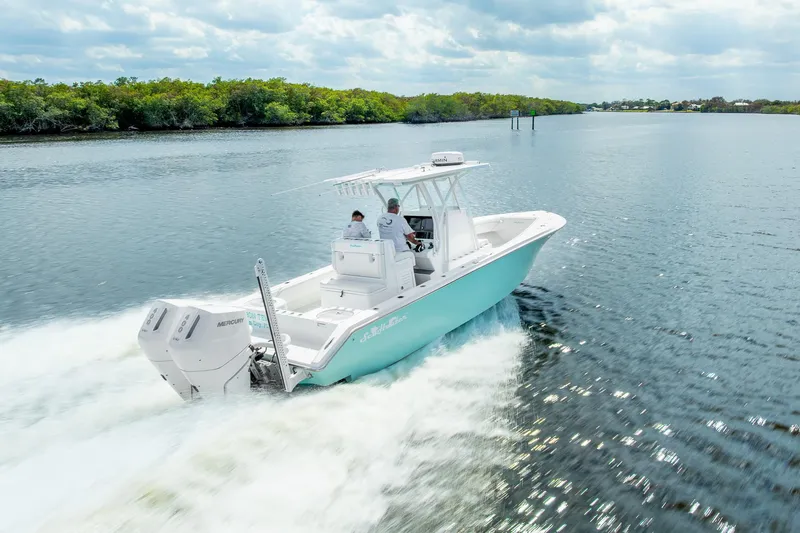 This 2024 SeaHunter 28 is powered by twin Mercury 400 V10 (01/19/2029 MPP GOLD) JPO Verados with joystick piloting, autopilot, and Skyhook. Built with performance and fishability in mind, it features a custom Seafoam Green hull with matching hardtop underside and custom painted white engines.