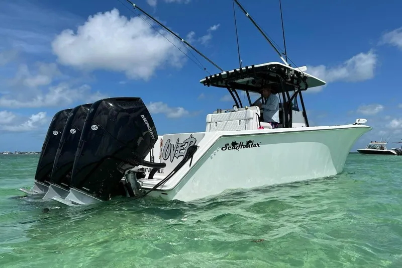 Repowered in July 2024 with triple Mercury 400 V10 engines, the boat reaches up to 70 MPH and maintains a 37 MPH cruise at approximately 1.0 mpg on a full load, improving to 1.15-1.2 mpg once fuel is burned down.