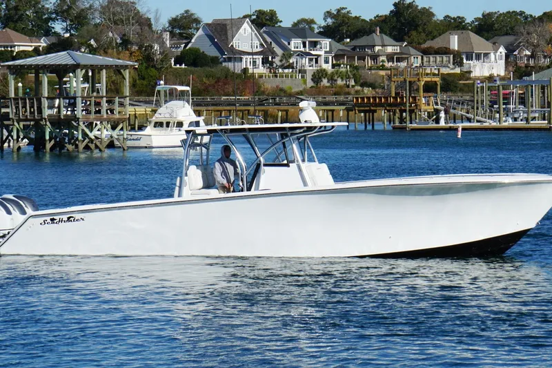 With an overall length of 39 feet 3 inches and a beamy 11’6” width, this fishing machine is at the top of its class for a good reason. The Seahunter Tournament 39 features eight power options and offers triple or quad outboard configurations. Like all Seahunters, it boasts a long list of standard features and an options list that is sure to accommodate any of your needs.