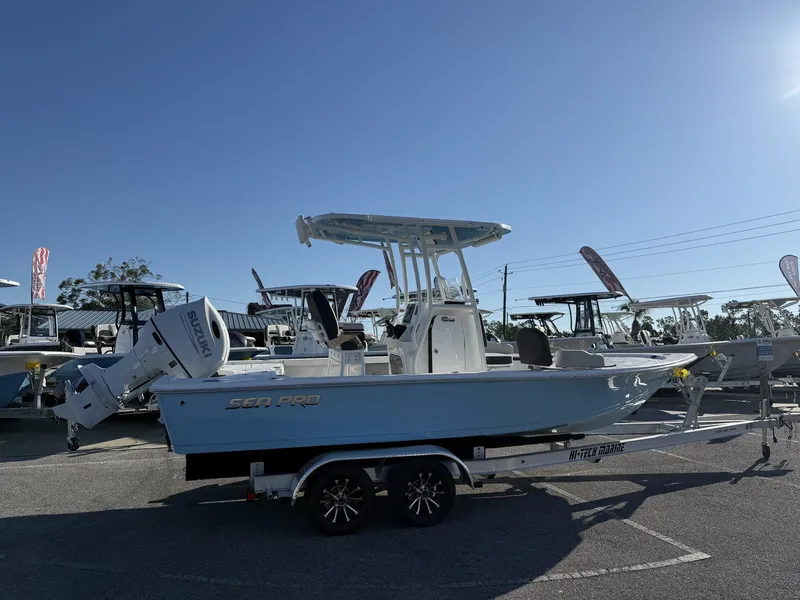 BRAND NEW 2026 SEAPRO 230 BAY WITH FORWARD SEATING DELUCE LEANING POST DELUXE CONSOLE UPGRADE STEREO BLK POWDER COAT UPGRADE THRU HULL TRANSDUCER SIMRAD GPS HELM PAD FIBERGLASS HARD TOP TRIM TABS LIGHT BAR AND MORE THIS IS LOADED OUT!